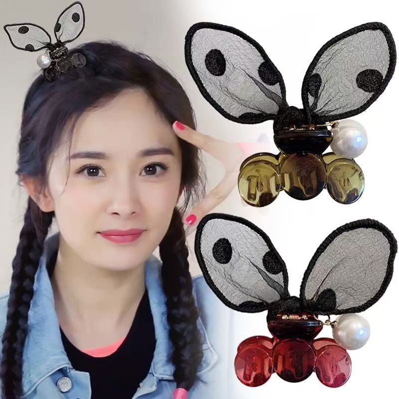 韓国のウサギの耳の小さいヘアピンの女性は真珠のペンダントの蝶結びの髪を挟みます。