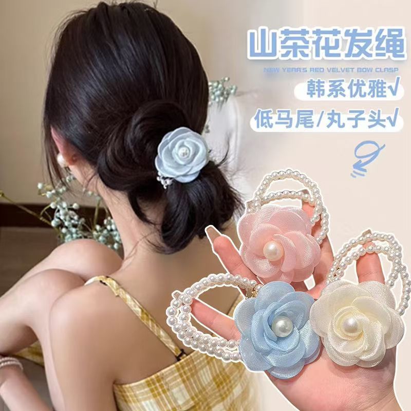 ツバキの花の髪の輪のバラの花の紐の小さい香の風の髪の紐の真珠は髪の毛のゴムの筋のネットの赤い超仙の少女を刺します