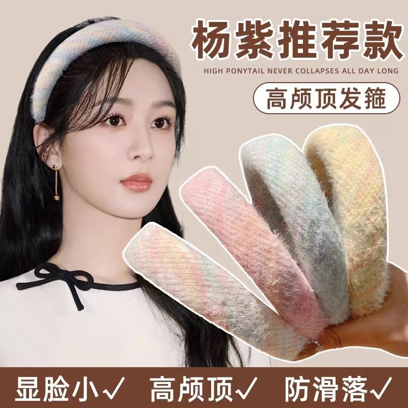 カラーの毛のカチューシャの女性2023の新型の甘美で高い頭の頂の広い辺のカチューシャの髪飾りの顔を洗って化粧をして滑り止めの髪飾りをします。