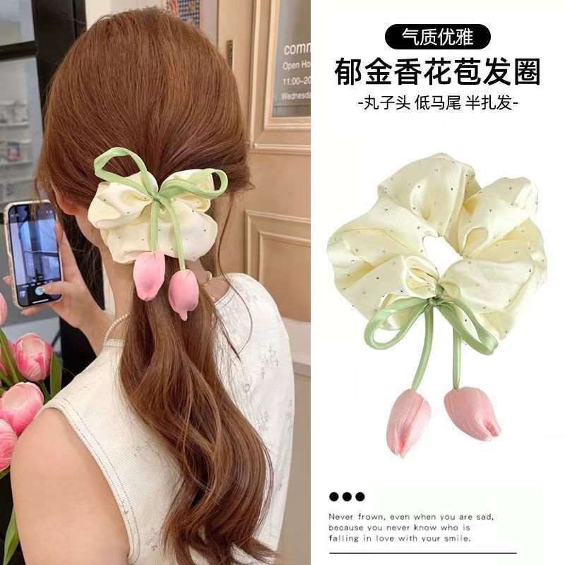 甘いチューリップのつぼみヘアゴム、ポニーテール、万能ヘアゴム、ゴムバンド、インリボンヘッドバンド