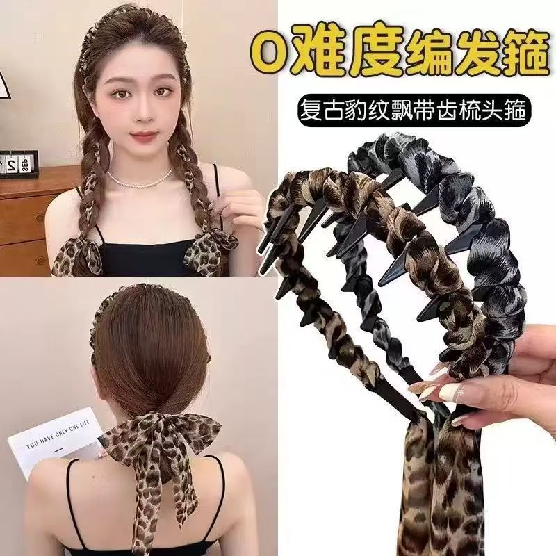 新しいレトロなヒョウ柄リボンヘッドバンド、ハイエンドのオールインワン編み込みヘッドバンド、リバーシブルの高頭頂ヘアピンアクセサリー