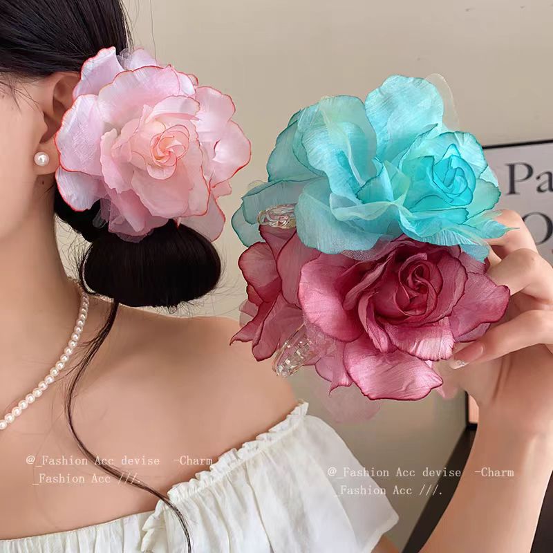 スーパーフェアリーファブリックメッシュフラワーヘアクリップ女性用、写真撮影用、雰囲気のある気質、サメクリップ、ヘアアクセサリー、高級感
