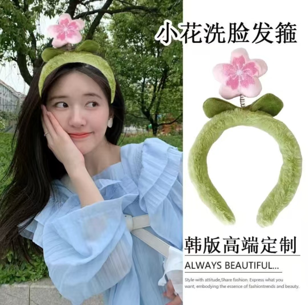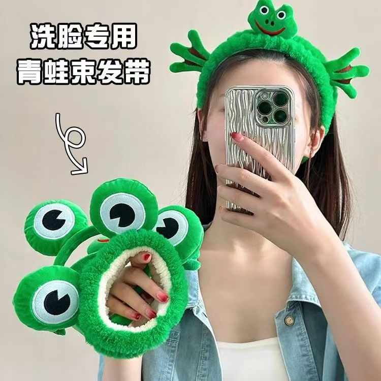 カエルのカチューシャが可愛いです。女性の顔を洗って化粧する専用のカチューシャをつけます。