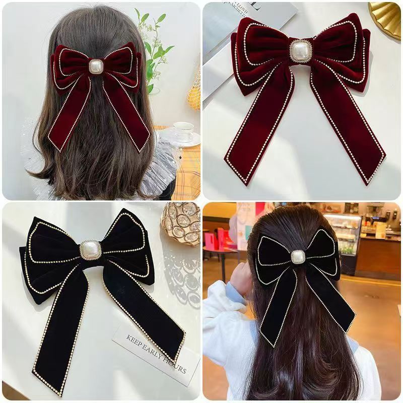 チェーンのベルベットの蝶結びのワインの赤いスプリングは女性の大きいサイズの後頭部の新年のクリスマスの髪飾りのヘアピンのトップクリップを挟みます。