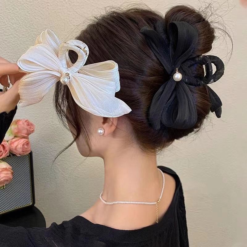 しわの蝶結びの真珠のヘアピンの女性の後頭部のヘアピンの大きいサイズのサメのクリップの2024の新型の髪飾りの女性