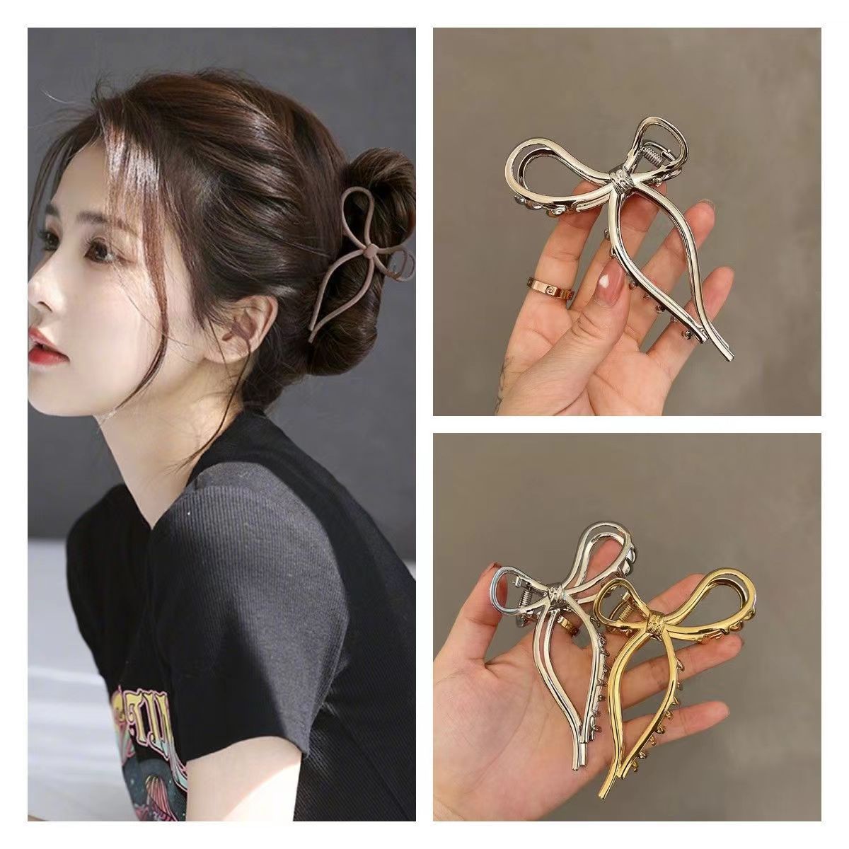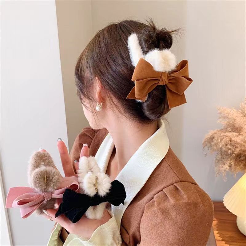 大きいサイズの蝶結びのぬいぐるみは女性の秋冬のフレンチの髪を挟みます。