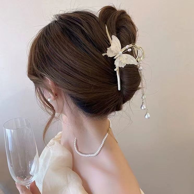 ヘアピンの後頭部の蝶結びは女性2023の新型の流蘇国の古風なハイエンドのサメのクリップの漢服の頭飾りをつかみます。