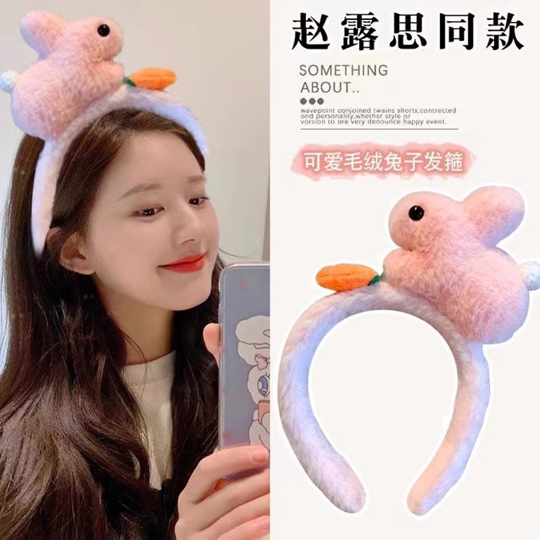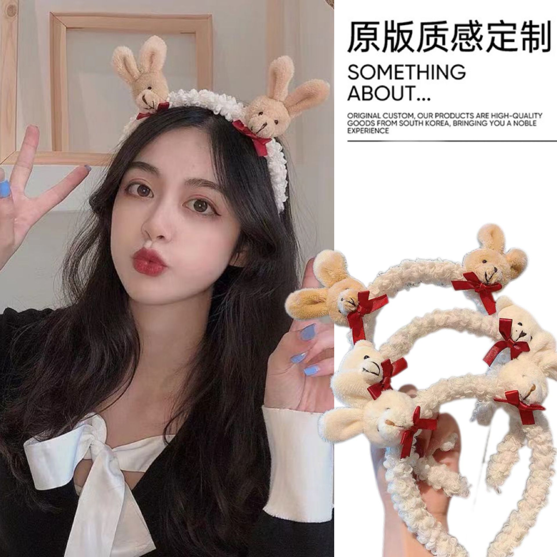 少女の韓国版のかわいいウサギは顔を洗ってカチューシャをします。