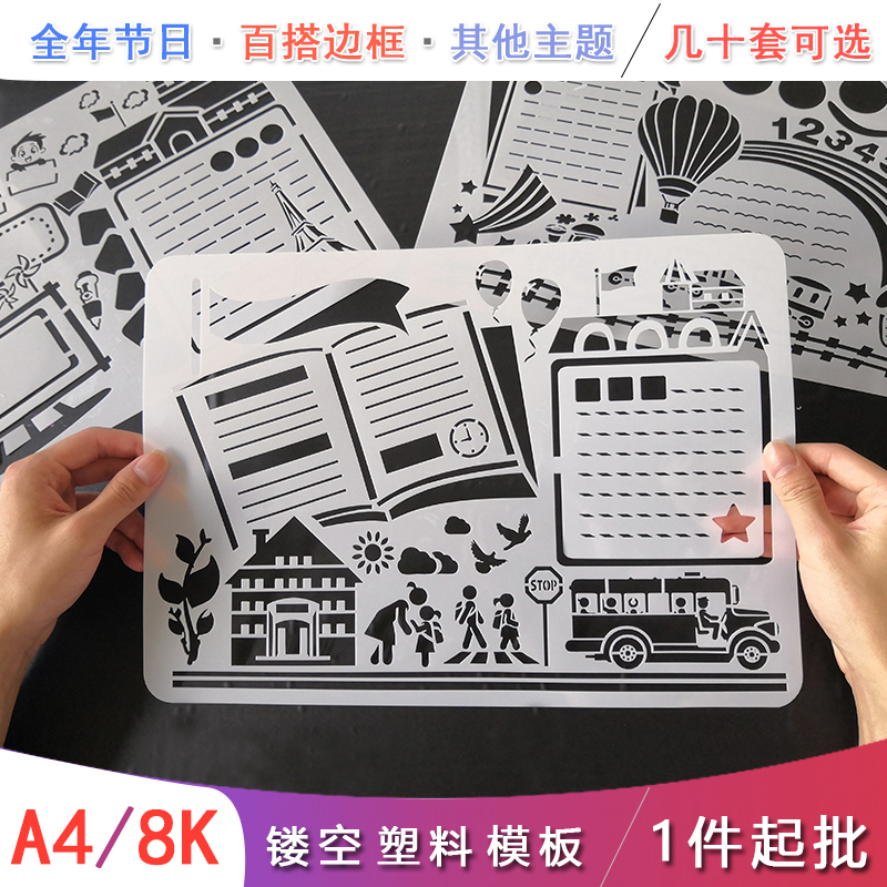 8kオープンの透かし彫りのプラスチックのテンプレートの小学生の手は新聞を書き写します。