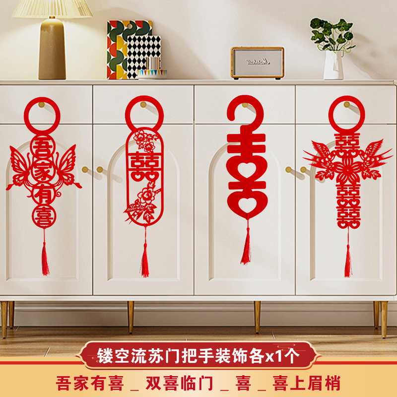 結婚部屋に結婚ドアの取っ手を配置して、結婚式の喜字の玄関に男性の寝室の女性の新しい部屋を飾っています。