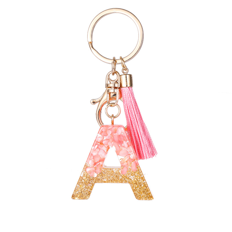 金箔のピンクのタッセルのキーホルダー26英語樹脂のアルファベットのペンダント欧米のタッセルのファッションバッグのプレゼント