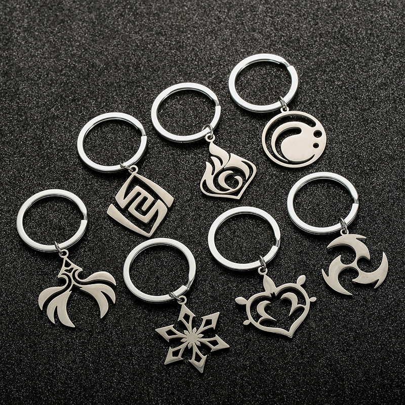人気ゲーム周辺機器ステンレススチールキーホルダー、ファイヤー、ロック、グラス、アイス、風、水、雷のペンダント、絶妙な漫画周辺機器