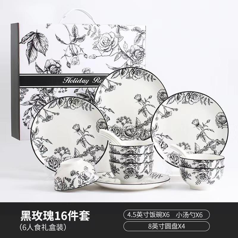 Junmei ブラックローズ食器セットお土産クリエイティブセラミック家庭用ボウル、プレート、スプーンビジネス会員ギフト新築祝いギフト