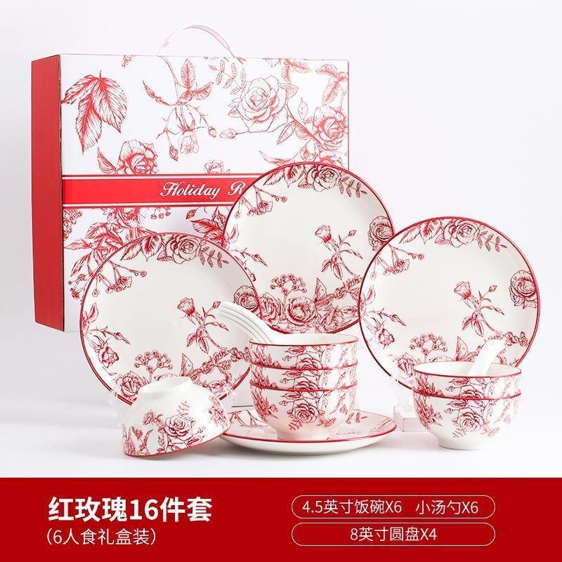 Junmei レッドローズ食器セットお土産クリエイティブセラミック家庭用ボウル、プレート、スプーンビジネスイベント会員ギフト