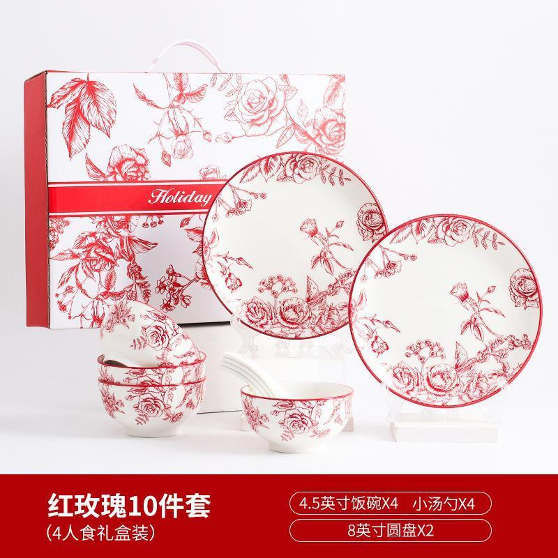 Junmei レッドローズクリエイティブセラミック食器セット家庭用ボウル、プレート、スプーンビジネスイベント会員ギフトお土産