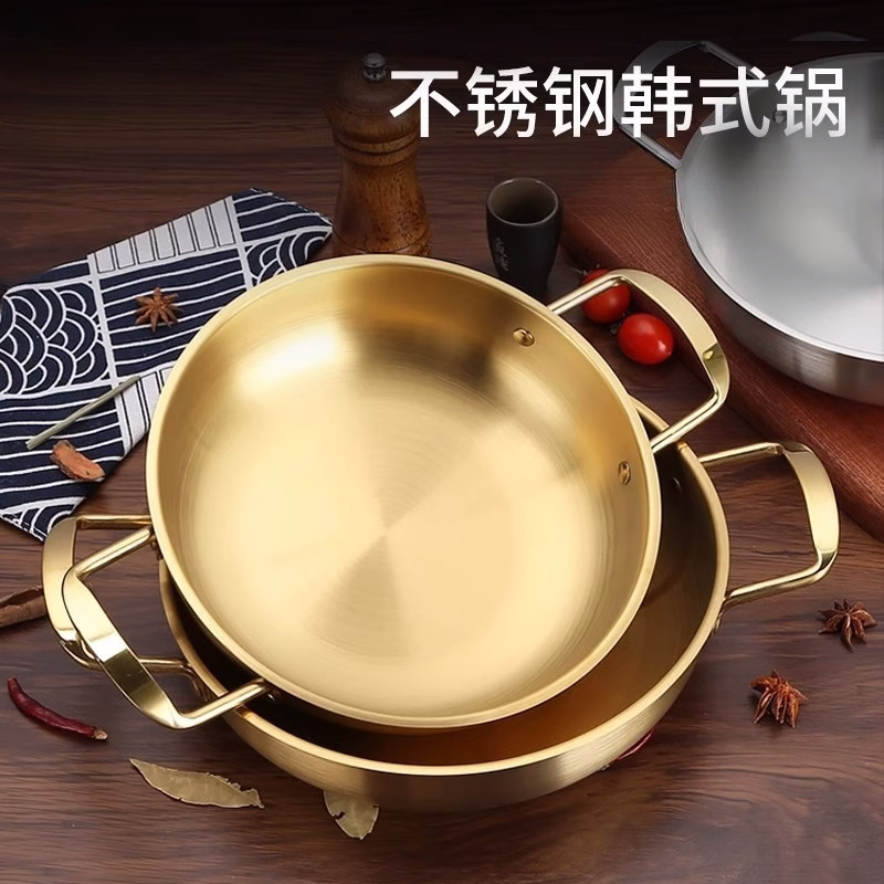 ステンレスの韓国式のカップラーメンの鍋のシングルの小さい鍋の金色の双耳の乾燥している鍋の子の家庭用ガスのスープの鍋の海鮮の鍋