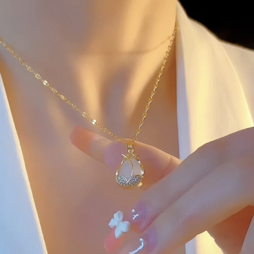 チタン鋼のネックレスの女性の新しい猫眼石チューリップの花は精巧でシンプルなフラッシュドリルのペンダント感があります。
