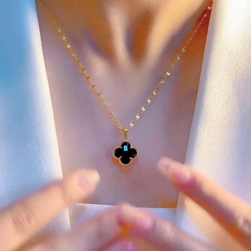 黒い水晶の四つ葉のクローバーのネックレスを生放送します。女性の高級デザイン感があります。