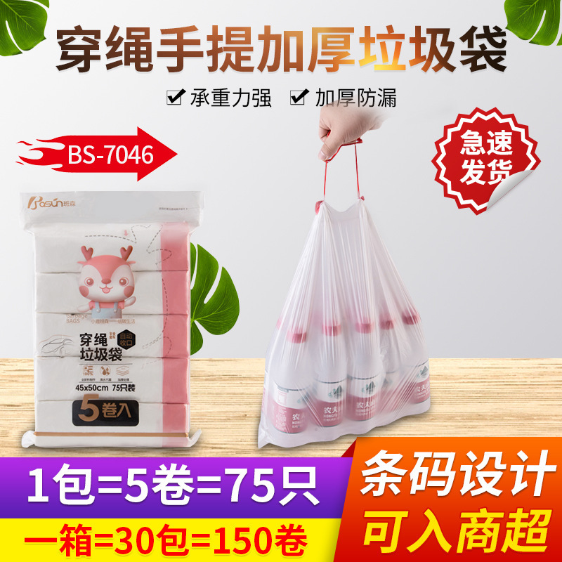 自動引き口ひもゴミ袋は台所引きひも式ゴミ袋を厚くして、一度にひもの白いゴミ袋を通す