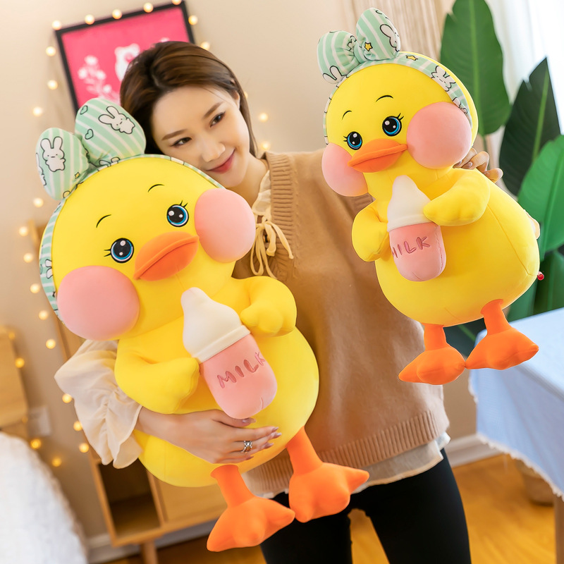 哺乳瓶アヒルのぬいぐるみのぬいぐるみの大きいサイズのかわいい化粧哺乳瓶アヒルの女の子は寝て枕の誕生日プレゼントを抱きます。