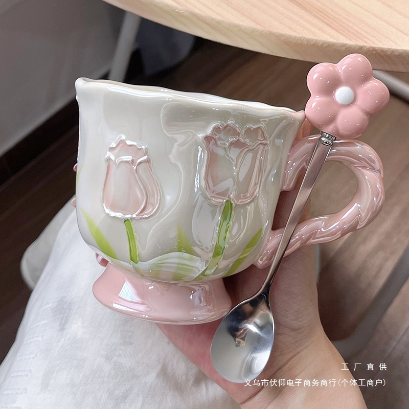 チューリップ高足カップマグカップ高颜値陶磁器カップ水カップ誕生日プレゼント女子結婚お土産
