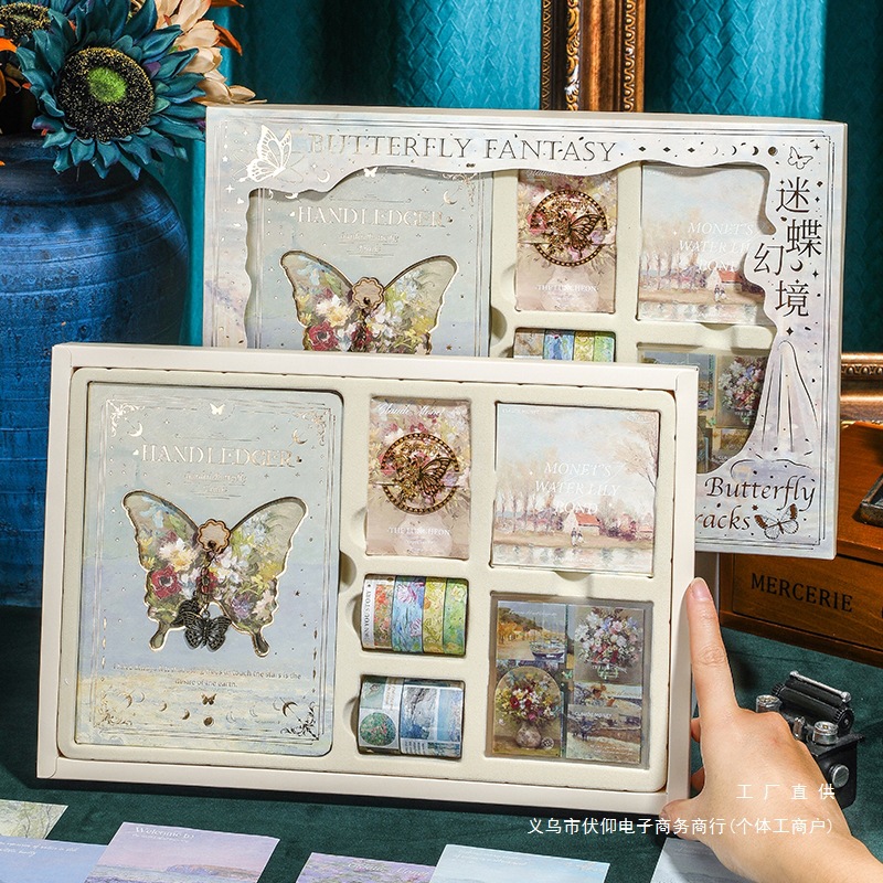 レトロな蝶の手の帳簿のセットのギフトボックス2025年の新型の女の子の手の帳簿のシールの大きいプレゼントの小学生のペン