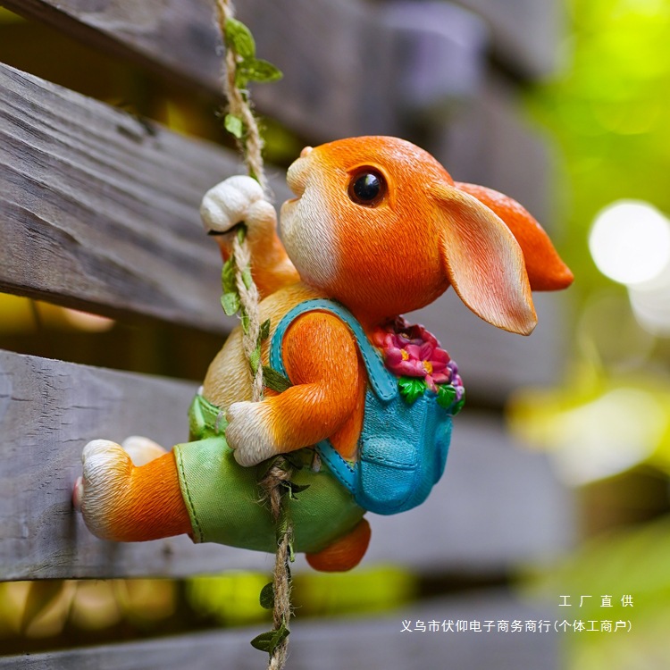 花園の木の上でウサギの壁掛け幼稚園の庭を登って屋外のパイプの装飾の植木鉢のペンダントを登ります。