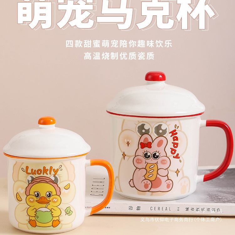 かわいいセラミックマグ大容量女性家庭用エナメルティージャーカップル蓋付き模造エナメルオフィスドリンクカップ