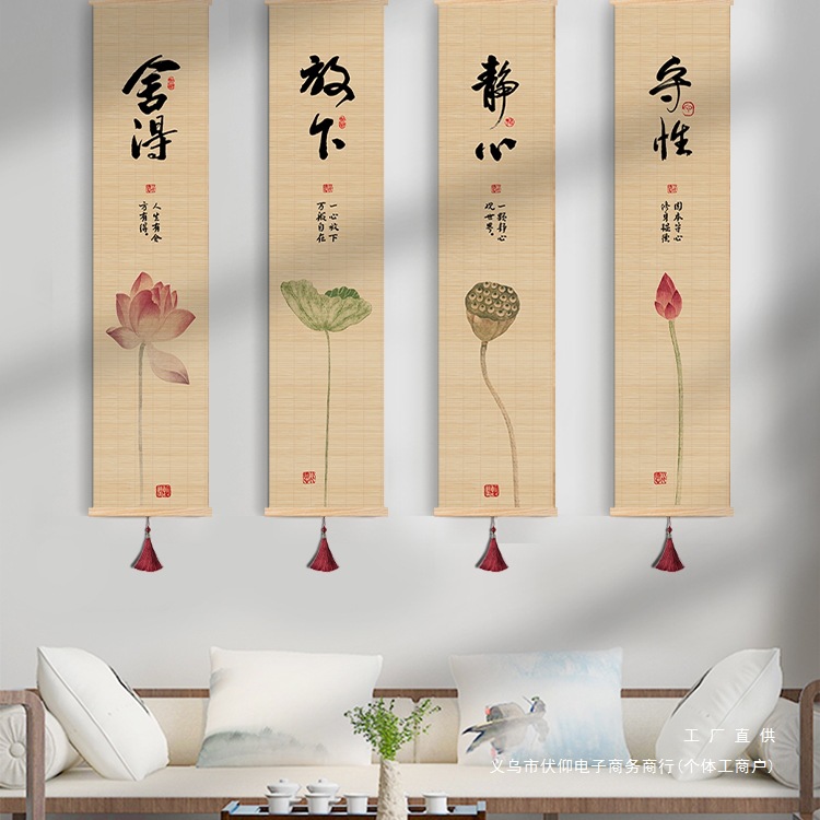新しい中国式の客間のソファーの背景の壁は禅意の茶室のハスの花の竹のカーテンを飾って書道の字の巻物の縦版を描きます。