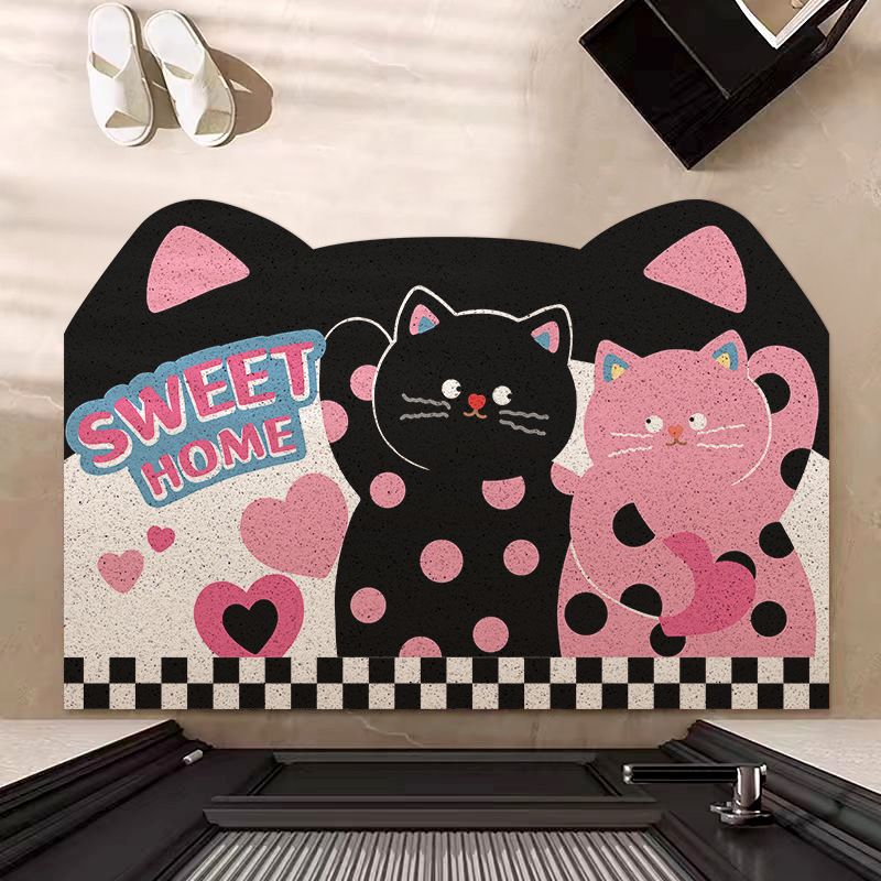 水玉模様の猫玄関カーペット、ポップスタイルのワイヤーリング玄関ドアマット、汚れ防止フットマット、滑り止めホームドアマット