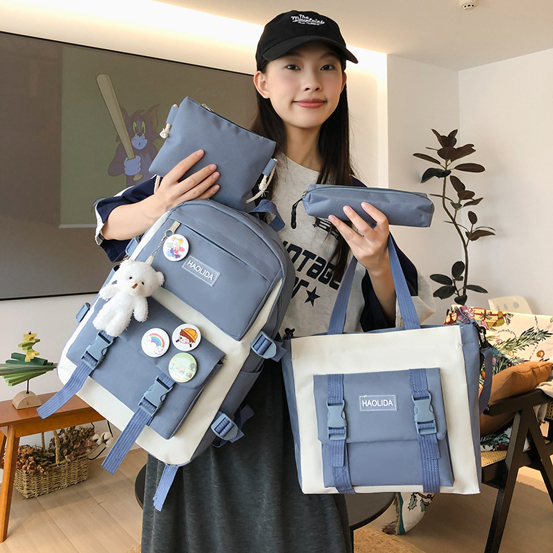 卸売りの多点セットの学生カバンの女子中学校のキャンバスのリュックサックの大容量のファッションは色にぶつかって補習の袋を持ちます。