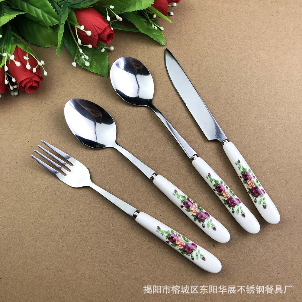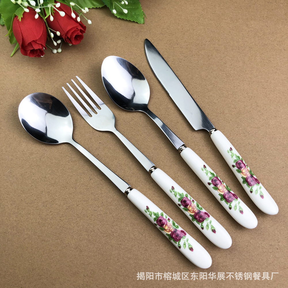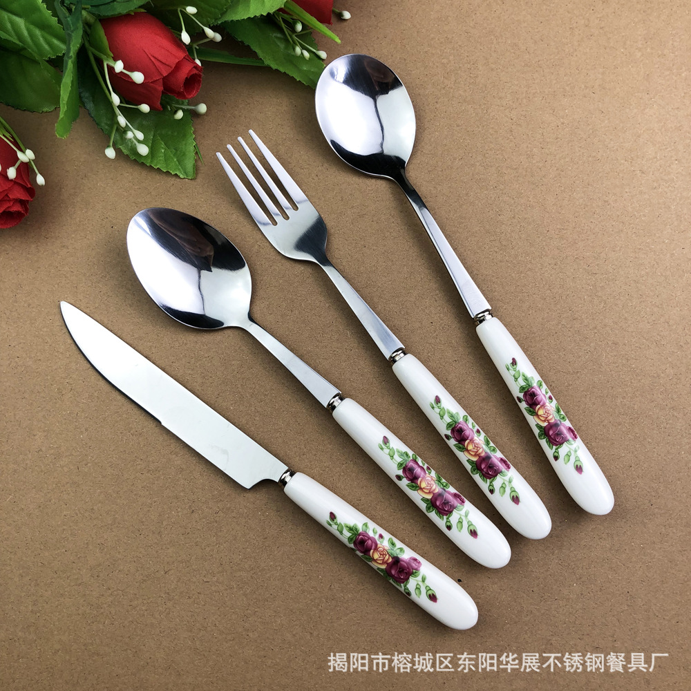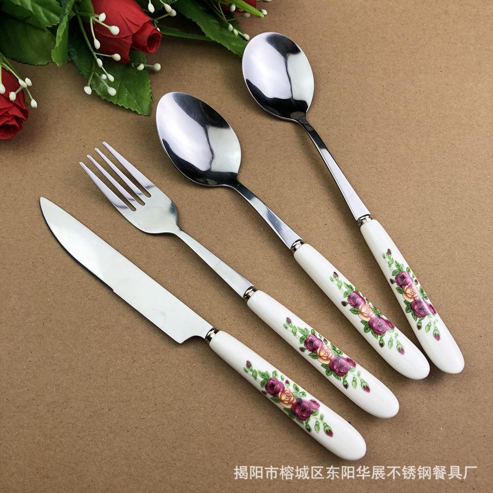 卸売 EU セラミックハンドルステンレス鋼ステーキナイフ、フォーク、スプーン食器ローズハンドルスーパーマーケットスープスプーンフォーク家庭用スープ工場