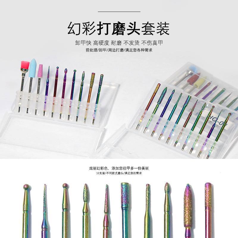 10本の箱にカラーメッキされたタングステン鋼のネイルポリッシュヘッドセットを入れて、皮をむいて金剛砂を落として工具を磨きます。