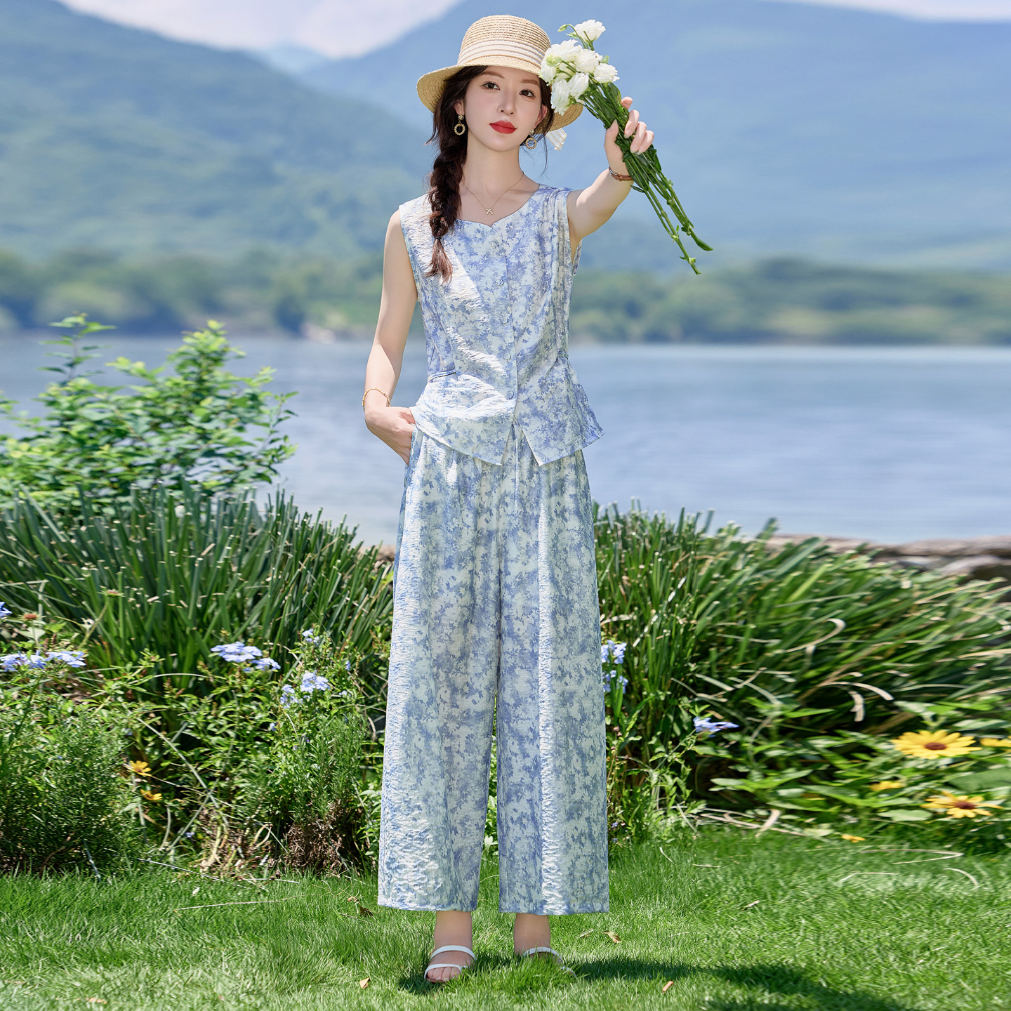 2025 新しい夏のスタイルのハイエンドエレガントなラウンドネックノースリーブウエストトップハイウエストワイドレッグパンツスーツ HG3273