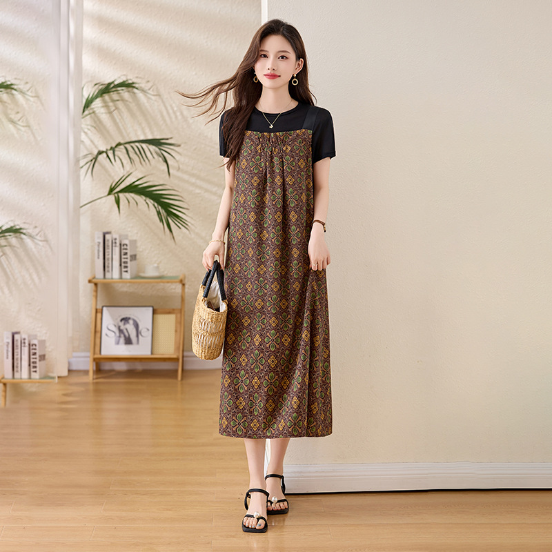 2025 新しい夏の女性の半袖 T シャツサスペンダースカート気質花柄ロングスカートツーピースドレス WN1020