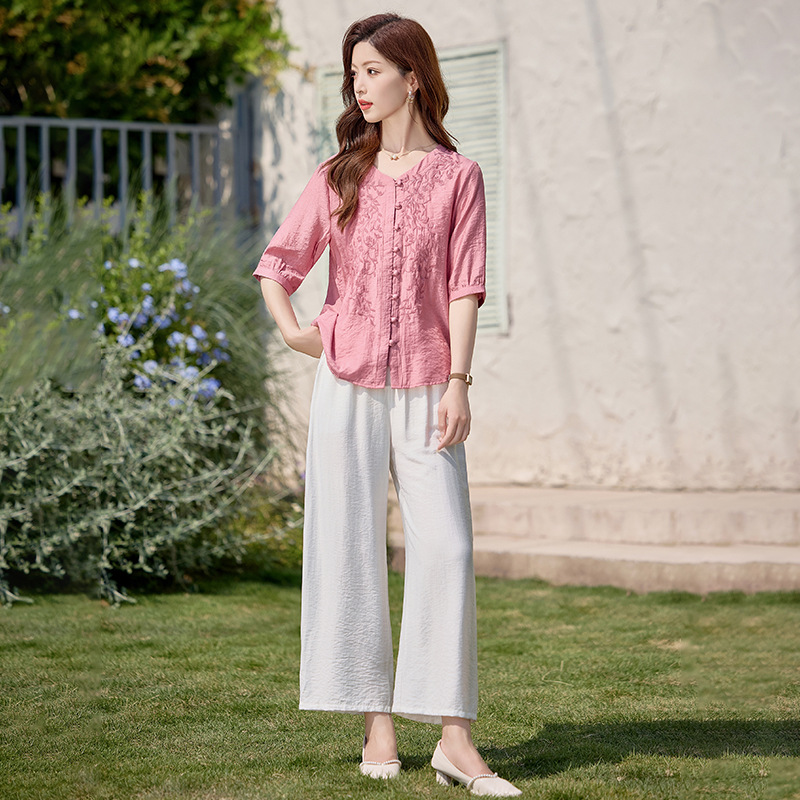 ファッションスーツ女性の 2025 夏の新作女性の刺繍ラウンドネックシャツワイドレッグパンツ 2 点セット MC8026