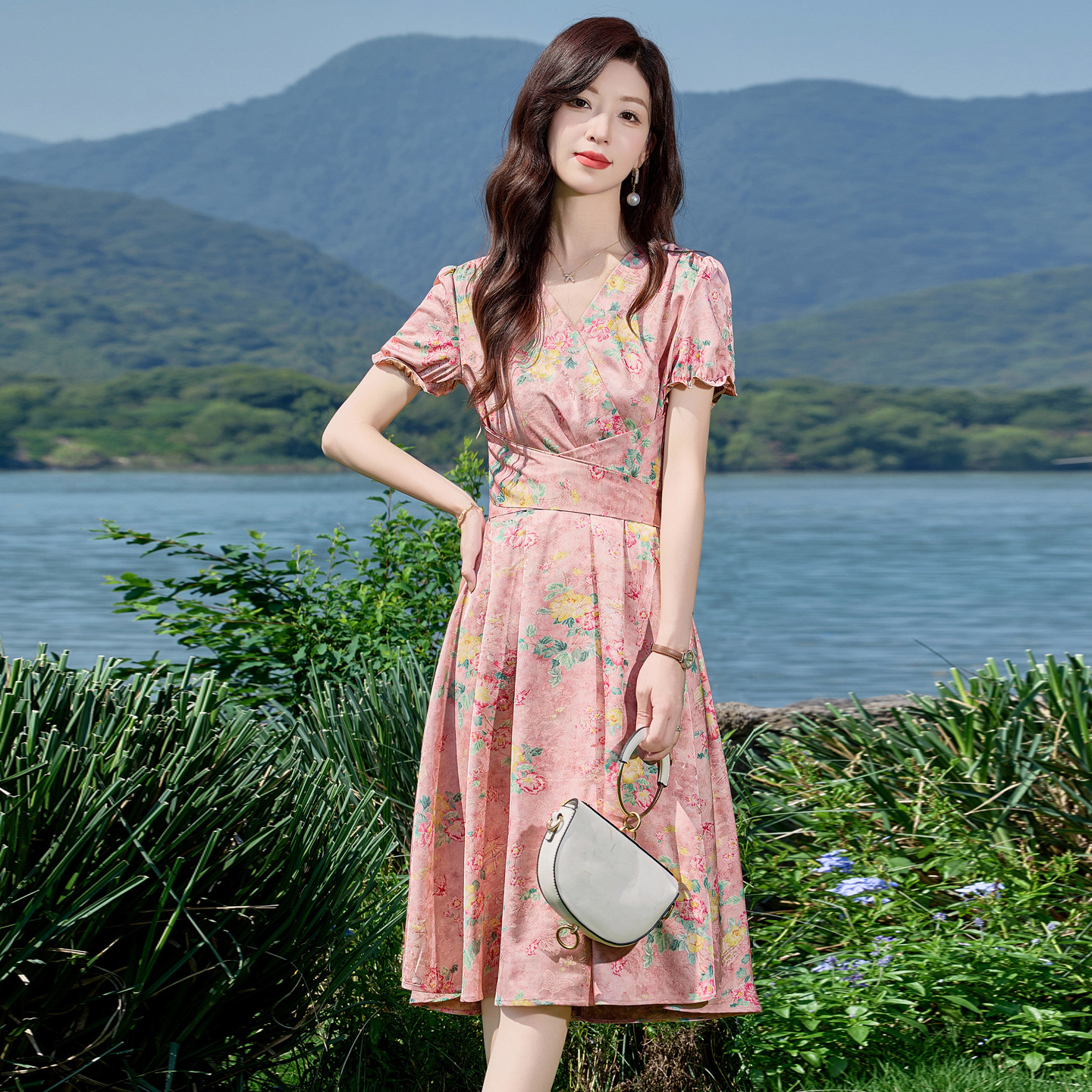 プリントドレス女性の薄い 2025 夏の新しいファッション気質社交家ウエスト痩身ミッドレングススカート LB2877