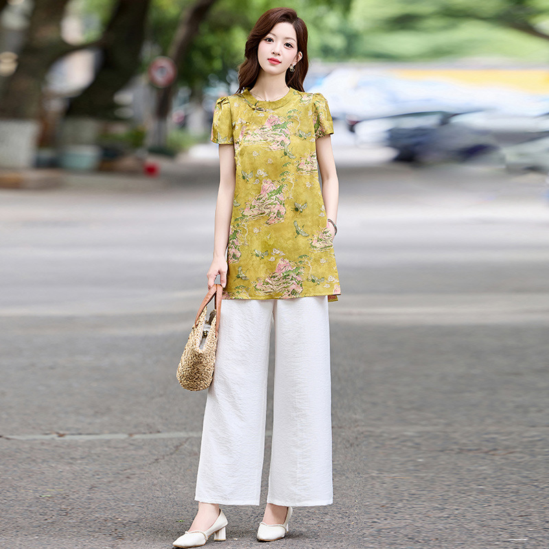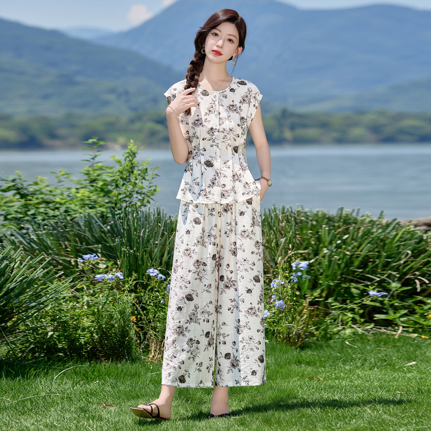 ファッションスーツ 2025 夏の新スタイル年齢軽減プリント快適なトップファッショナブルなワイドレッグパンツ 2 点セット LB2868