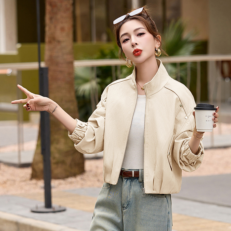 女性の皮の服の2025春の新型の婦人服の立襟のファッション的な洋風pu皮のジャケットのショートコートXG9965