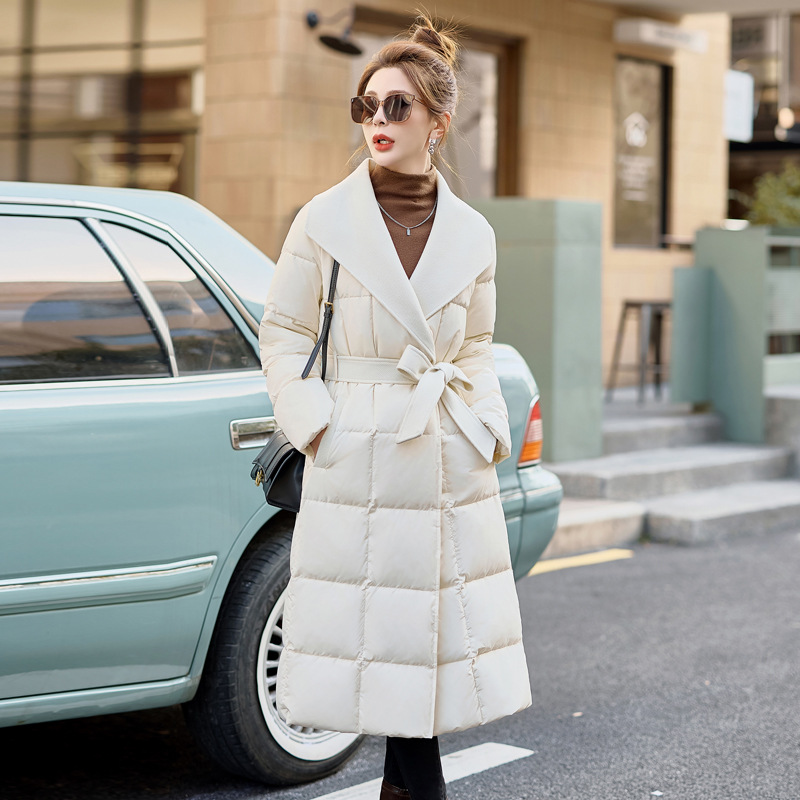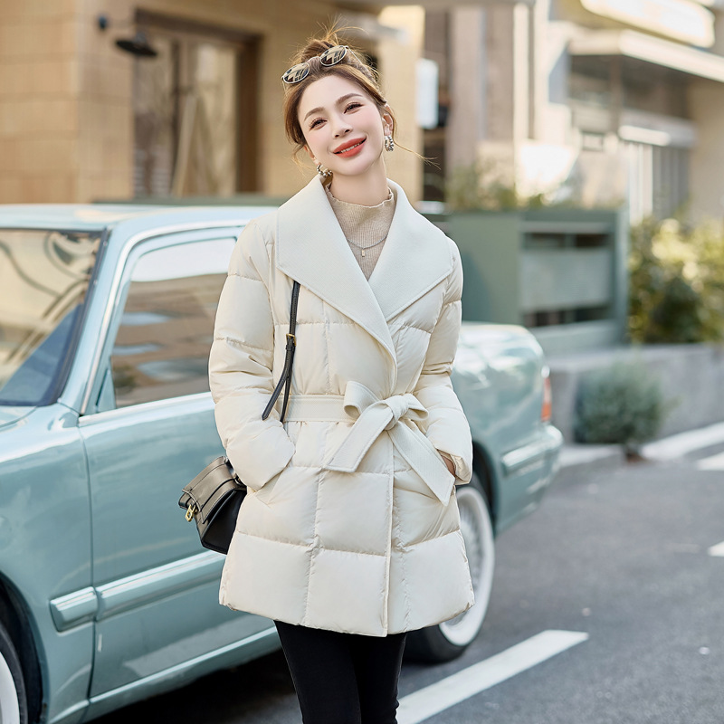 女性用ダウンジャケット2024冬90白鴨パイルの新型ストラップが腰をつないで大襟コートHR228をつなぎ合わせた
