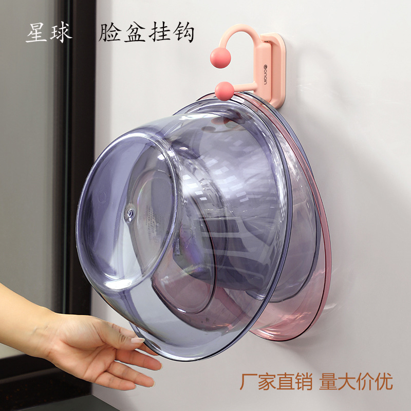 穴を開けずに洗面器を吊るせる多機能回転収納ラック、壁掛け用強力粘着フック、釘不要で洗面器を吊るせます。