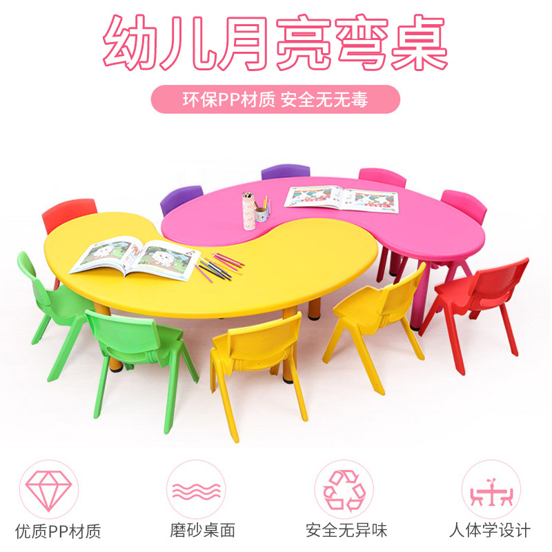 幼稚園の厚いプラスチックの月のテーブルは子供を昇降させて三日月のテーブルと椅子のセットを学ぶことができます。