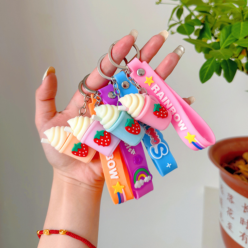 アイスクリームの虹ミルクティーカップのキーホルダーはミルクティー店のプレゼントのペンダントを押して、キーホルダーを押して安い卸売りをします。