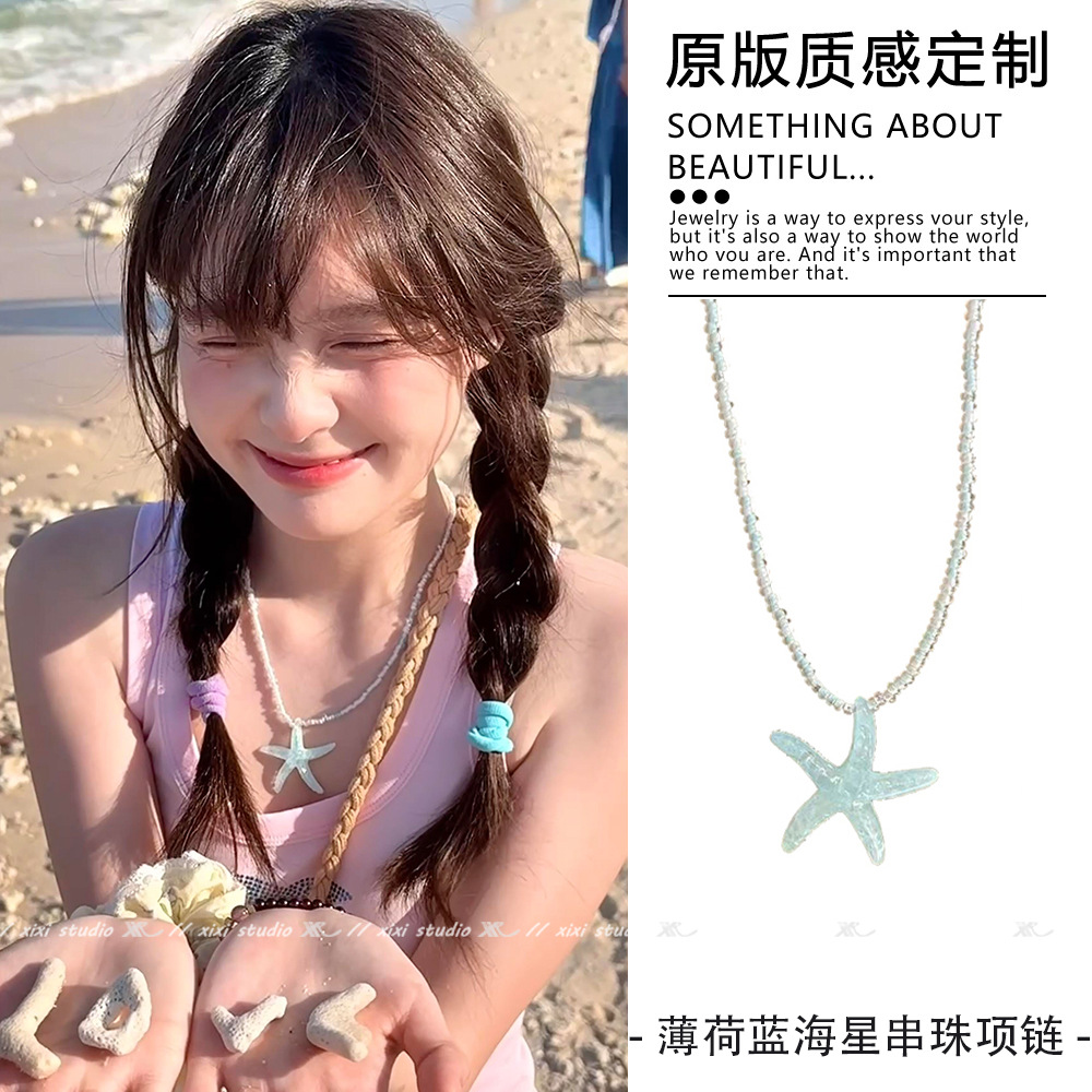ミントの青い海星のペンダントのビーズのネックレスの夏の清新な鎖のチェーンの海辺は旅行して写真を撮ります。