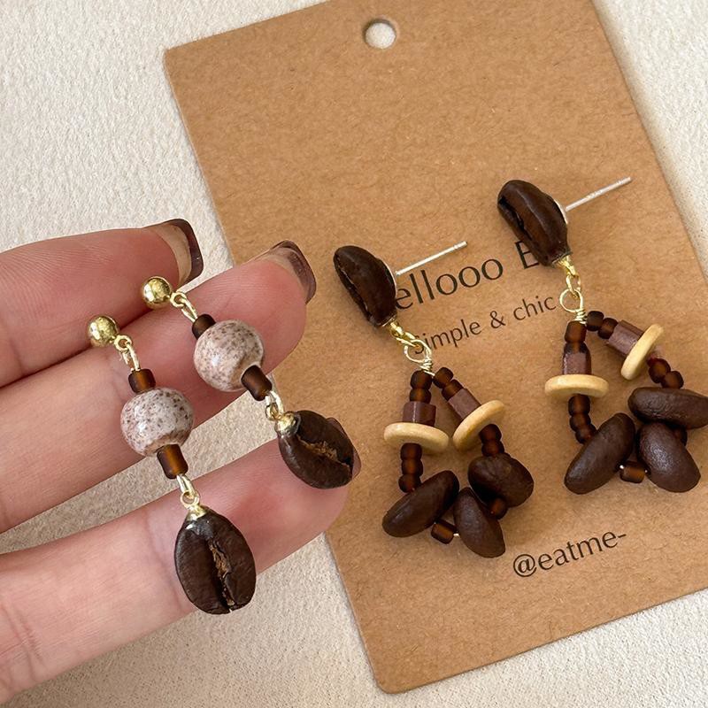 レトロ文芸大衆デザイン感コーヒー豆ピアス女性不規則木製ビーズ新中国式民族風イヤリング