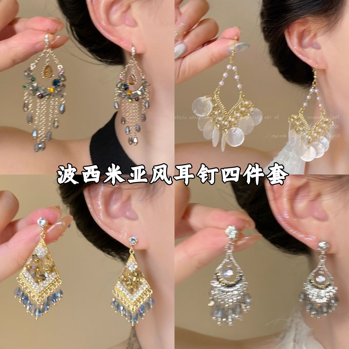 「エキゾチックな女神」ロングクリスタルタッセルレトロイヤリング蚊取り線香イヤークリップ女性用ピアスなし四角顔と丸顔イヤリング