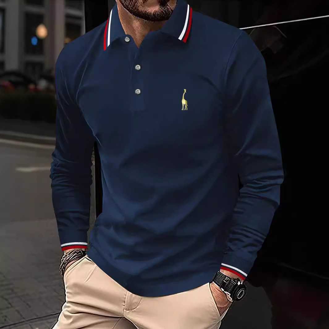 秋冬越境メンズカジュアル折り襟長袖色合わせポロシャツ男ファッションプリント長袖tシャツポロシャツ男