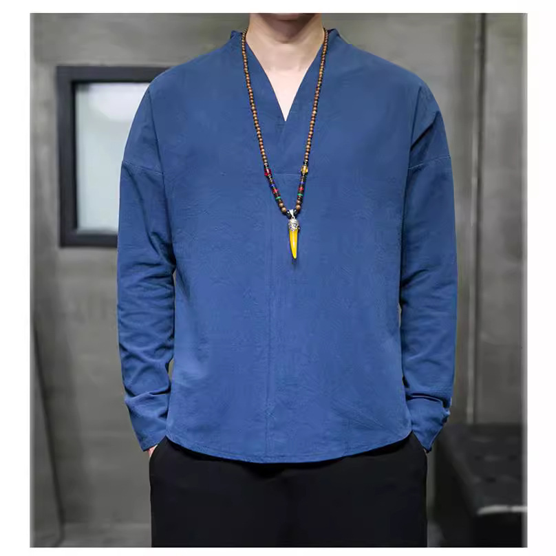 中国風2024クロスボーダー春夏メンズカジュアル長袖tシャツ漢服居士禅修綿麻ボトムシャツ男