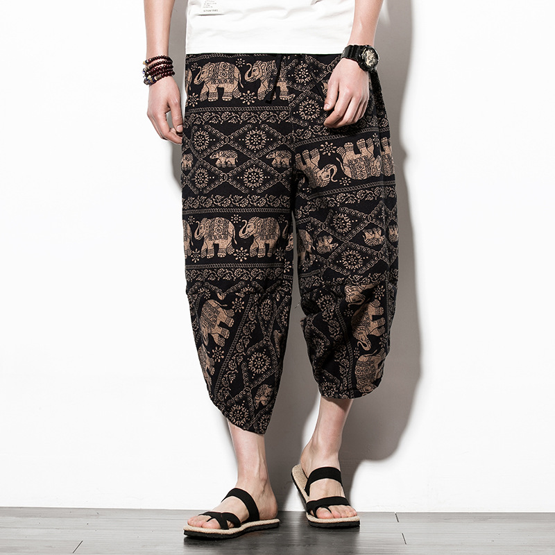 2024国境を越えた夏服男性七分ズボン男性亜麻大サイズ中国風ビーチパンツ砕花薄いゆるい男性パンツ