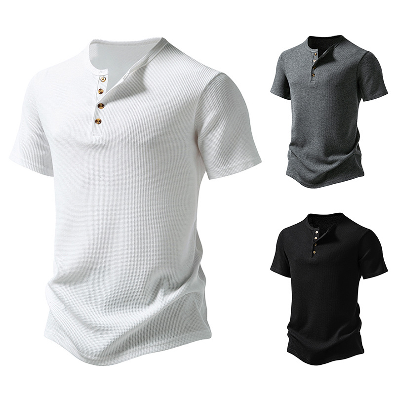 2024国境を越えた男性アマゾンの新型三粒ボタン男性ヘンリー坑条半袖tシャツ男性カジュアルシャツ